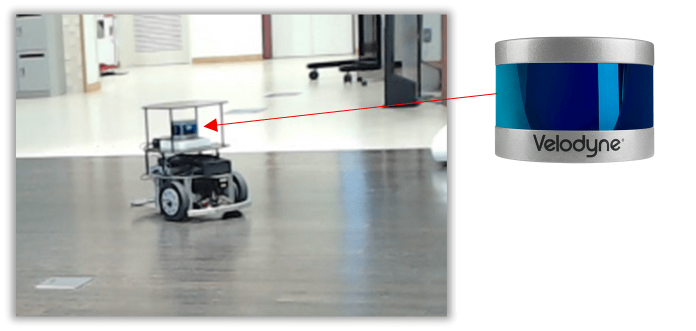 図 1 LiDARセンサ(VLP-16)を搭載した自律移動ロボット