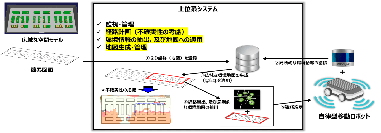 広域空間では、リアルタイムでの環境の把握や地図の生成・更新方法等について課題も多く、ロボットが走行中に観測する局所的な環境情報(点群データ)の活用などによる解決策を見出したいと考えております。本年度は、前述の要素技術をシステムに適用し、実証実験を試みることを予定しております。