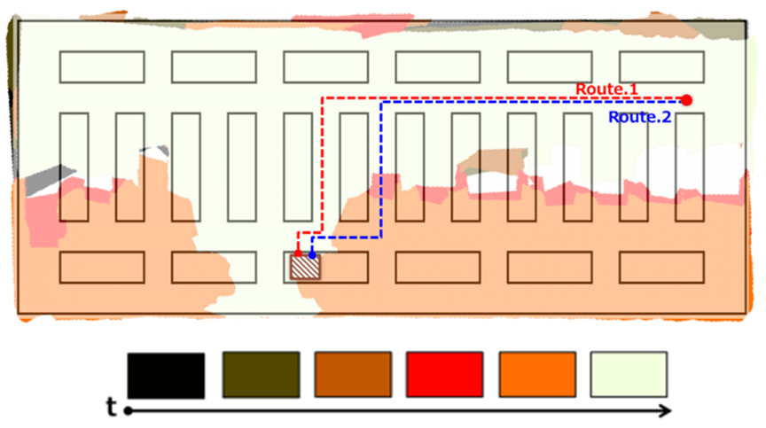 そのため、本研究では空間内の不確実性の度合いをコストとして算出し、ロボットの経路導出の要素として利用することで、不確実性を考慮した経路導出を試みています。図3は、不確実性の度合いを色で表現したものですが、時間の経過と共に、空間内の確実性が変化している様子を示しています。色の濃淡は、時間の経過による変化を表しており、黒色が最も古く、白色が新しく観測された範囲であることを示しています。図中のRoute 1、Route 2は、搬送ロボット(●)がパレットまでの走行経路(同一距離)を示していますが、Route2には走行経路上に不確実性エリアを通過する区間が含まれていることが分かります。この不確実性をコストとして経路計画時の調整値として適用することで、ロボットの走行経路を変動させ、環境情報の確実性を意図的に高めることが出来るようになります。