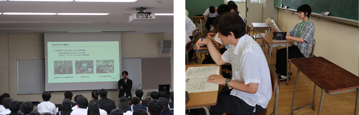 【内 容】原町高校数科学部の生徒が進めている研究活動に対し、会津大学及び福島大学の学生が大学での研究事例の紹介や実験方法、得られたデータの整理方法、論文及び発表用スライドの構成等について助言指導を行った。大学生らによる自身の研究に関する発表もあり、進路へのアドバイスにもつながった。