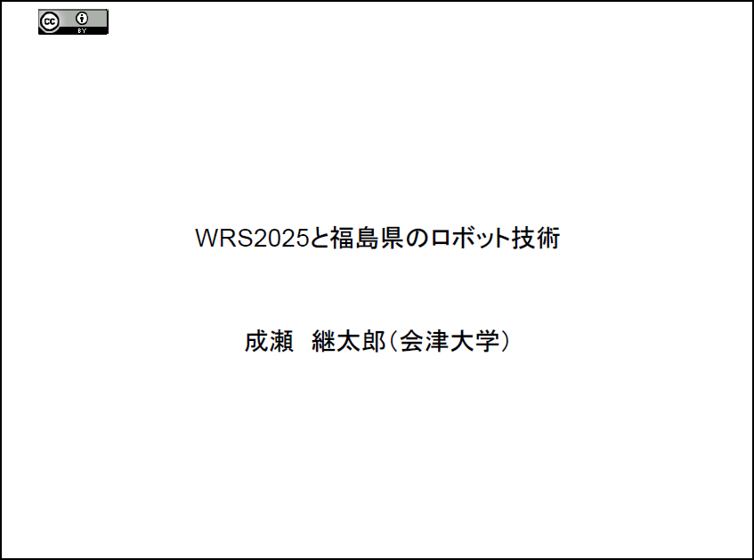 2025年10月29日に開催された令和7年度第1回ふくしまロボット産業推進協議会ロボット・ソフトウェア検討会にて会津大学成瀬継太郎教授が「WRS2025と福島県のロボット技術」という内容で発表されました。WRSを終えての課題や、今後の展望について発表されました。以下のスライドは発表時に使用された資料になります。是非ご覧ください。